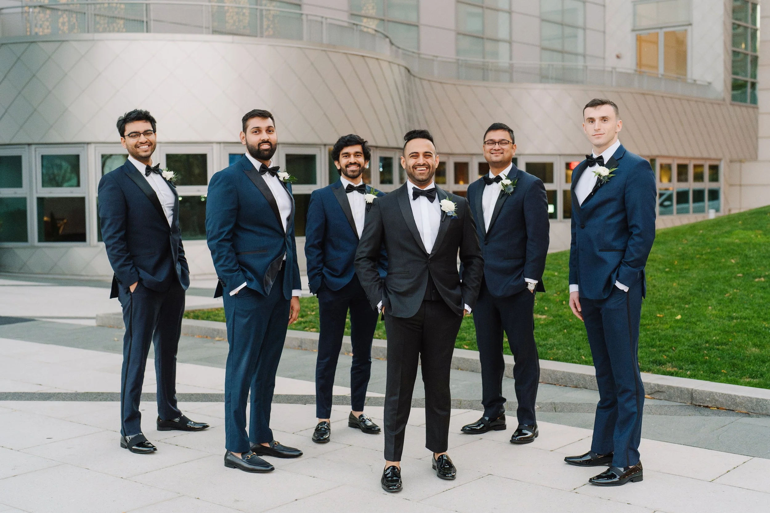Your wedding party deserves more than rental racks. Our groomsmen packages ensure every guy looks and feels his best with custom fits, cohesive styling, and a sharp finish that matches your moment. We make outfitting your groomsmen effortless and elevated. Whether you're going for classic black tie or something a bit more personal, each package is built with intention, offering coordinated style, custom fittings, and premium fabrics designed to complement the groom without outshining him.